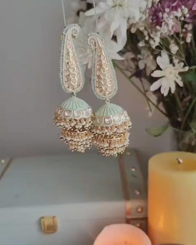 Pastel green meenakari Jhumkas in paisley Design embedded with intricate pearls piroi